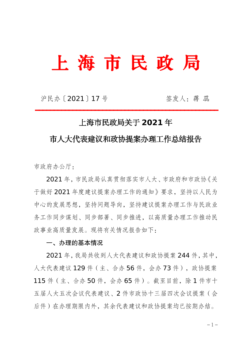 上海市民政局关于2021年市人大代表建议和政协提案办理工作总结报告 ( 2021-12-06 )