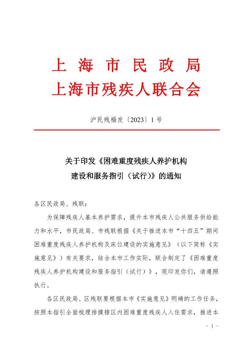 为保障残疾人基本养护需求,提升本市残疾人公共服务供给能力和水平,市民政局、市残联根据《关于推进本市“十四五”期间困难重度残疾人养护机构及床位建设的实施意见》(以下简称《实施意见》)有关要求,结合本市工作实际,联合制定了《困难重度残疾人养护机构建设和服务指引(试行)》,现印发你们,请遵照执行。