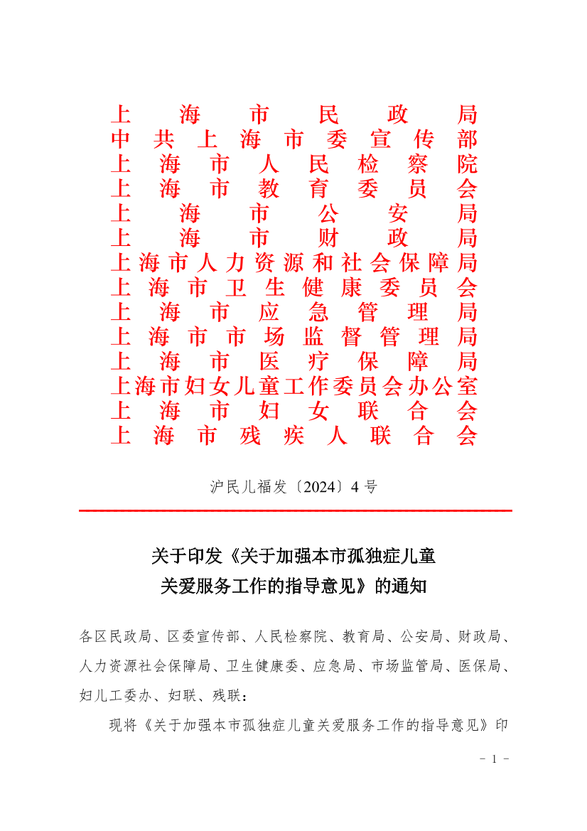 关于印发《关于加强本市孤独症儿童关爱服务工作的指导意见》的通知 ( 2024-03-30 )