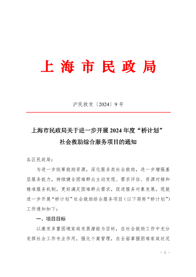 上海市民政局关于进一步开展2024年度“桥计划”社会救助综合服务项目的通知 ( 2024-05-22 )