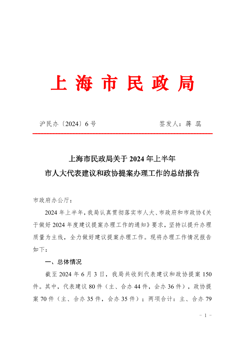 上海市民政局关于2024年上半年市人大代表建议和政协提案办理工作的总结报告 ( 2024-06-12 )