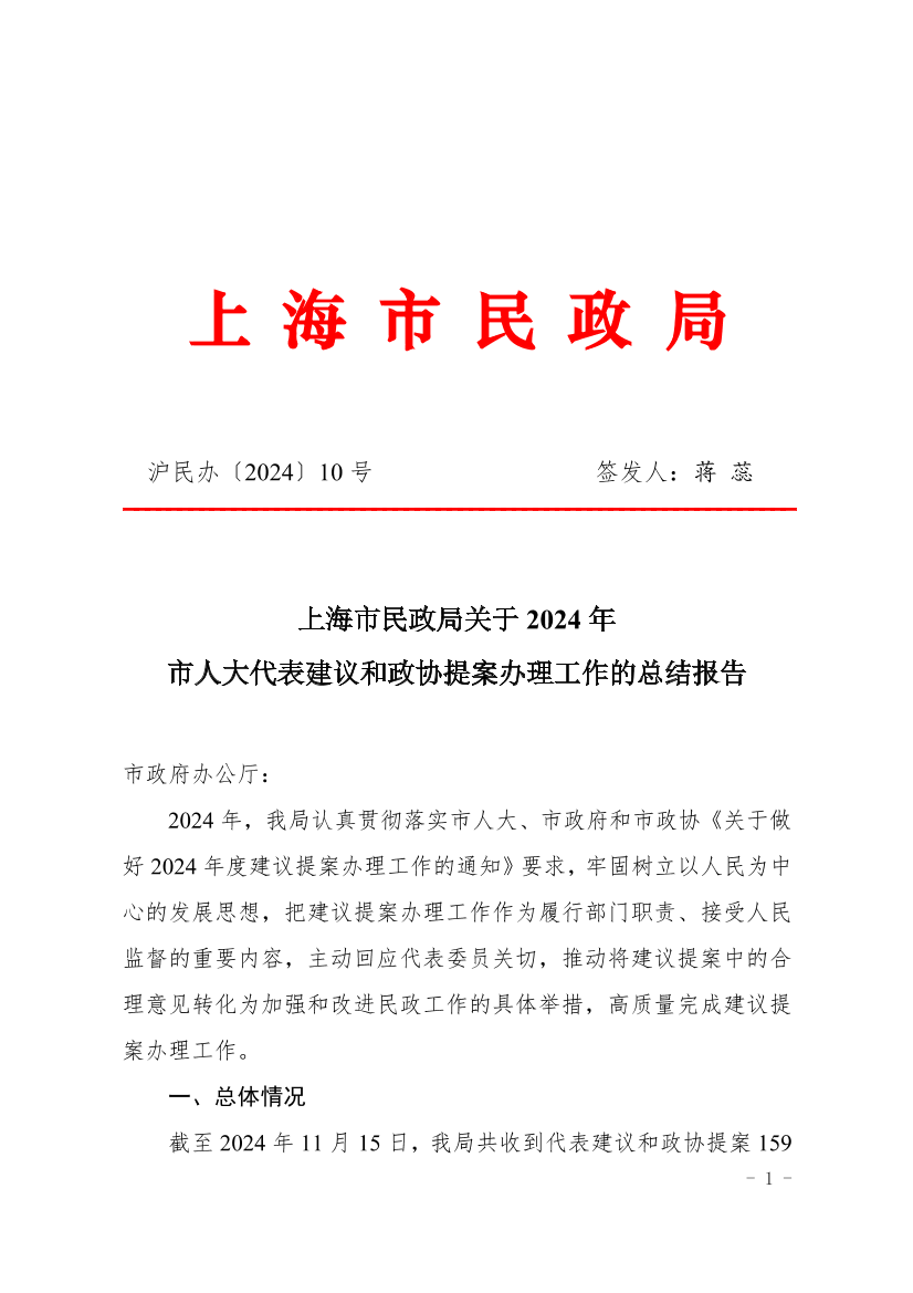 上海市民政局关于2024年市人大代表建议和政协提案办理工作的总结报告 ( 2024-11-22 )