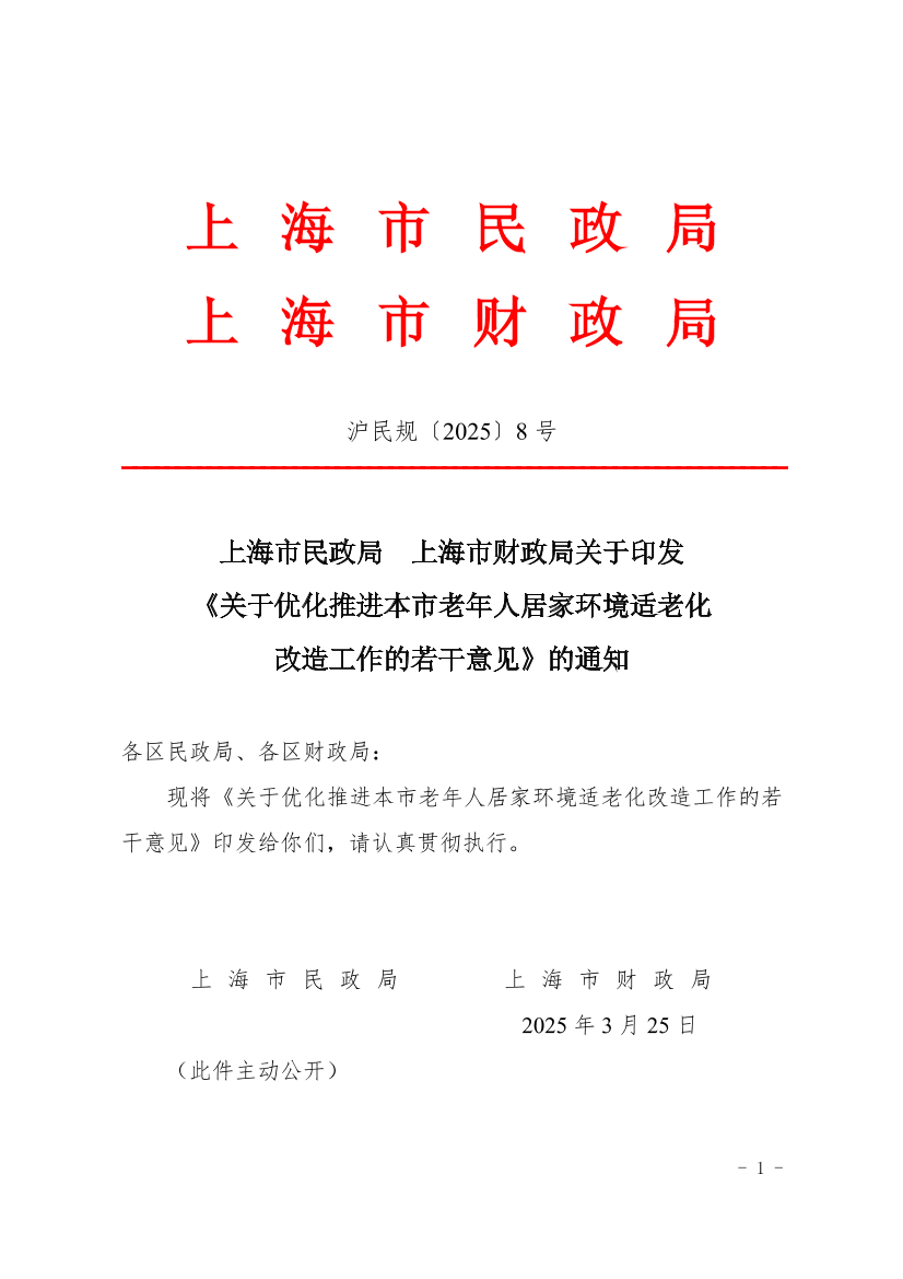 上海市民政局 上海市财政局关于印发《关于优化推进本市老年人居家环境适老化改造工作的若干意见》的通知 ( 2025-04-01 )
