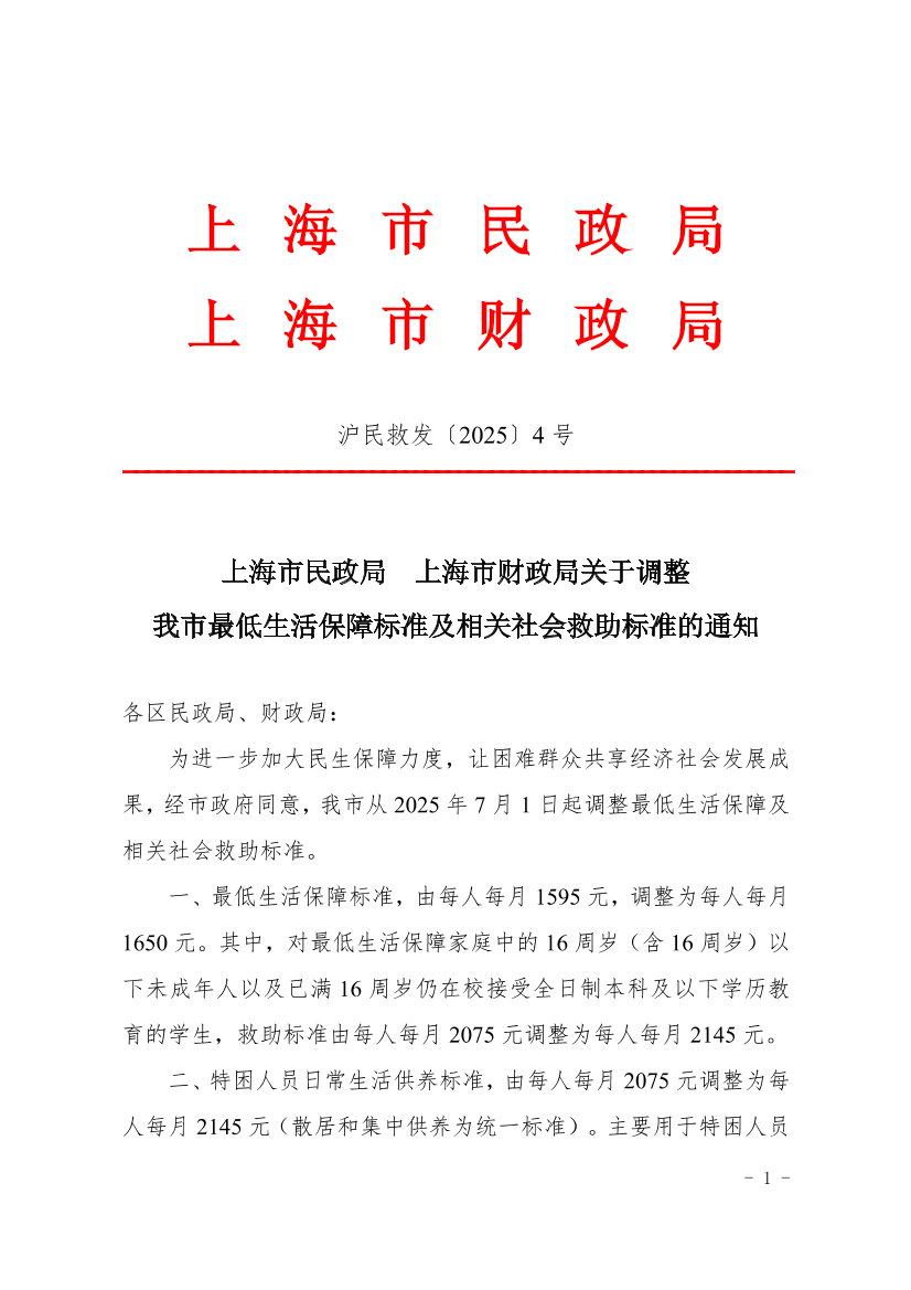 上海市民政局 上海市财政局关于调整我市最低生活保障标准及相关社会救助标准的通知 ( 2025-07-01 )