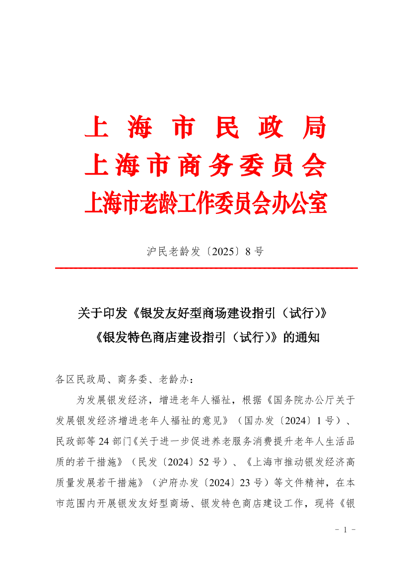 为发展银发经济,增进老年人福祉,根据《国务院办公厅关于发展银发经济增进老年人福祉的意见》(国办发〔2024〕1号)、民政部等24部门《关于进一步促进养老服务消费提升老年人生活品质的若干措施》(民发〔2024〕52号)、《上海市推动银发经济高质量发展若干措施》(沪府办发〔2024〕23号)等文件精神,在本市范围内开展银发友好型商场、银发特色商店建设工作,现将《银发友好型商场建设指引(试行)》《银发特色商店建设指引(试行)》印发给你们,请参照指引开展建设工作。